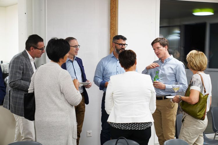 Legende zum Bild: Kantonsrat Urs Rhyner (zweiter von rechts) unterhält sich nach der DV mit Parteikolleginnen und -kollegen.