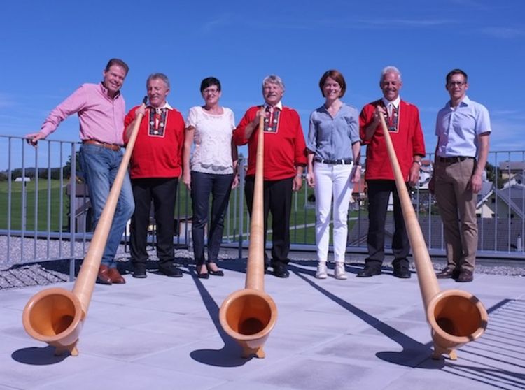 Die FDP-Nationalratskandidaten Dominik Zehnder (von links), Doris Kälin, Petra Gössi und Heinz Theiler zusammen mit Alphornbläsern auf dem Dach der Milchmanufaktur Einsiedeln.